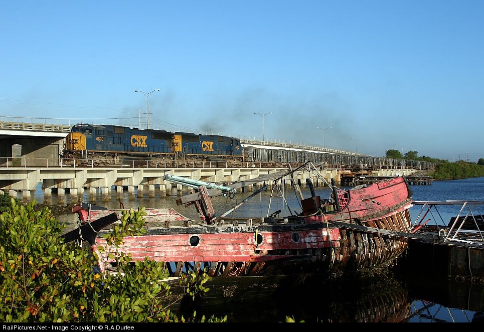 In a view from a nearby marina CSX train O841 crosses the Alafia River drawbridge on it's way to Big Bend. That old ship has seen better days!