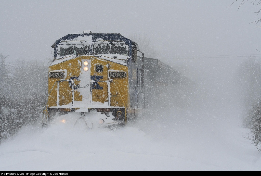 CSX Q62020 has a few inches of fresh powder to deal with and diminishing visibility as they hit the edge of the lake effect snow.