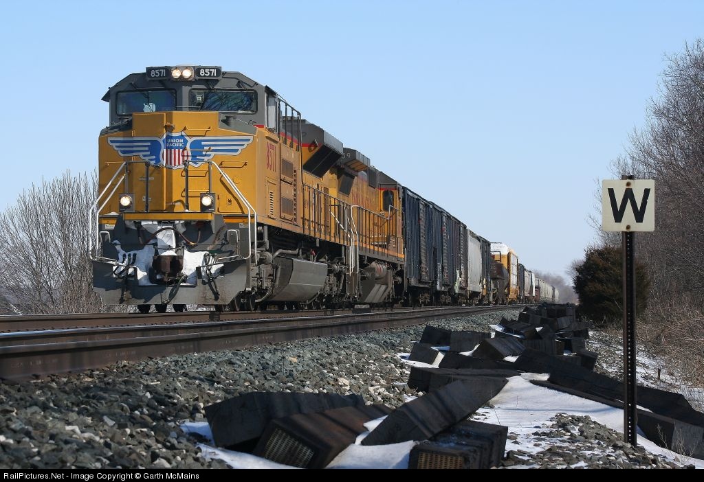 | A second section of Q515, S515, heads west with a couple UP units for power today, SD70ACe 8571 and C40-8 9139. |