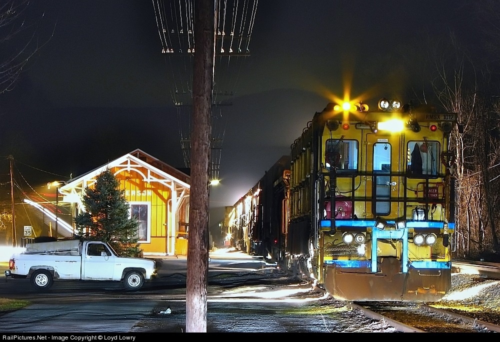| After a hard day's work, the railgrinder ties down for the night beside the depot in Alderson. The streaks in the left background are a steady stream of traffic that came through tonight to gawk at this massive piece of machinery. |