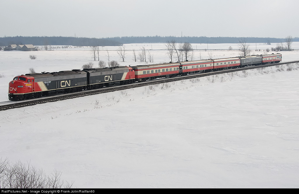 The sun peeks through the clouds as Quebec City bound CN 2008 Special Olympics Winter Games train, slowly glides on the siding in order to let VIA 25 roll by.