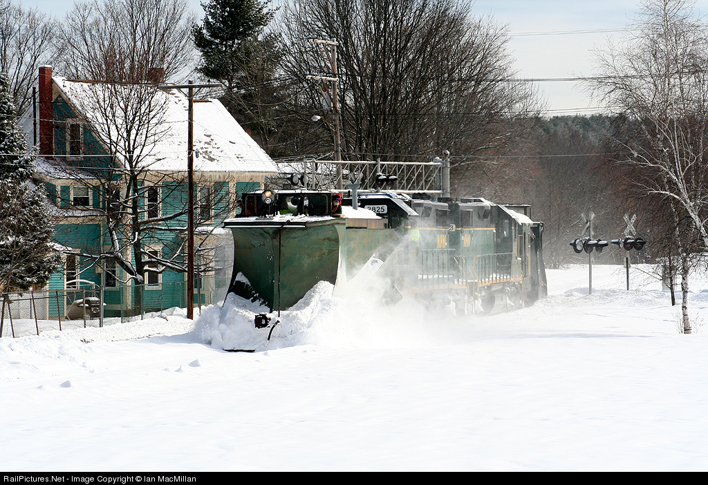 With borrowed MEC plows on each end, NHN's plow extra works north to clear their 38 mile main line of this winters record setting snowfall. While the snow depth is not much here, deeper snow banks await the train in Wakefield.