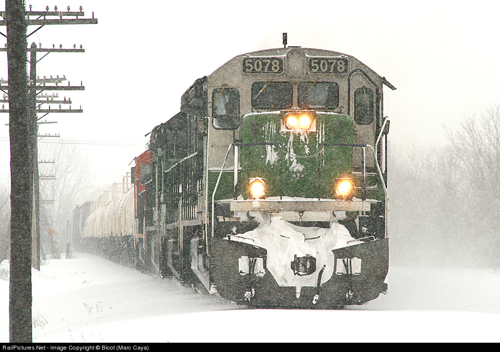4 noisy GEs are entering the town, clearing up the rails of a few inches of freshly fallen snow. MMA loco # 5078, 5021, 5026 and 2006. The post on the left are the remains of the CTC lines torn down by an ice stom in 1998. White clay tankers in tow are destined for the Irving paper mills in New-Brunswick (new contract)