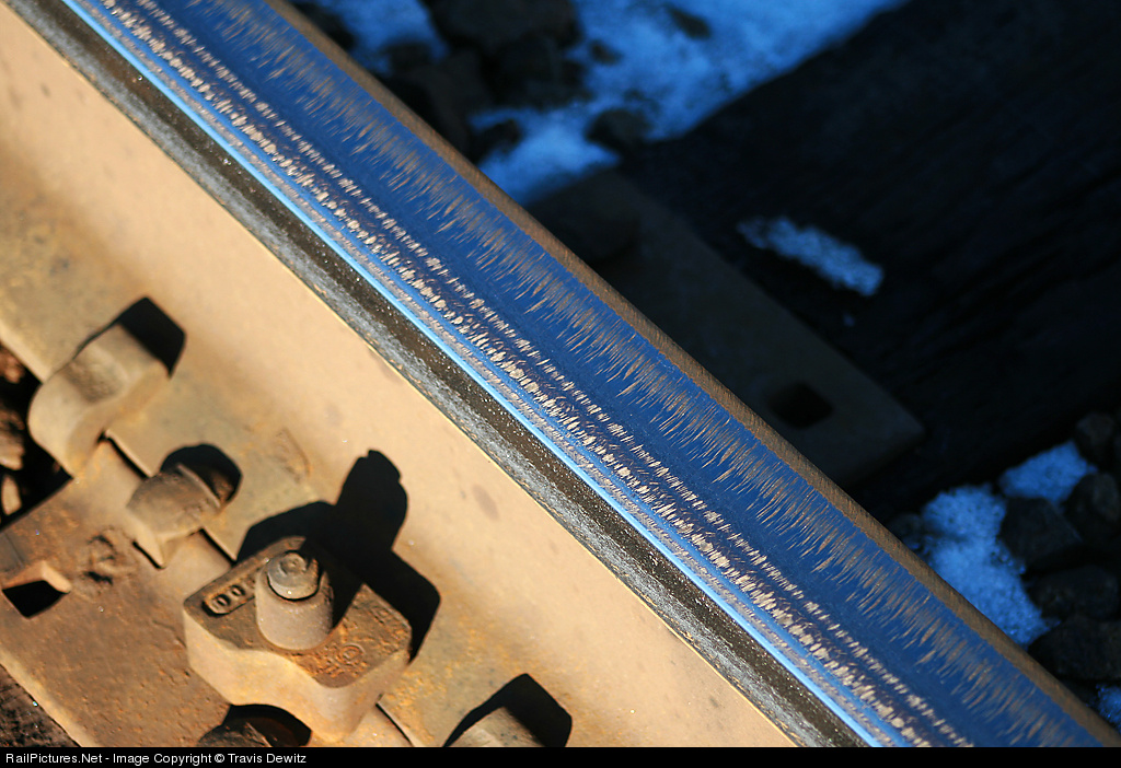 The sun brings out different colors on the rail head from where the rail grinder has left it's mark. Photo taken X-mas day just West of Northtown Yard.
