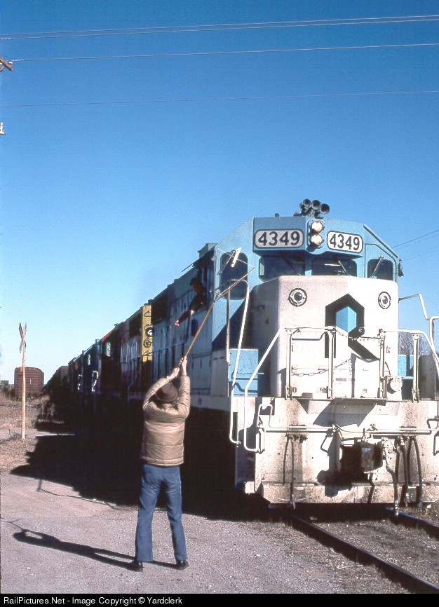 Operator Warren Kusik hands train orders up to the Extra 4349 West at Geary Okla.