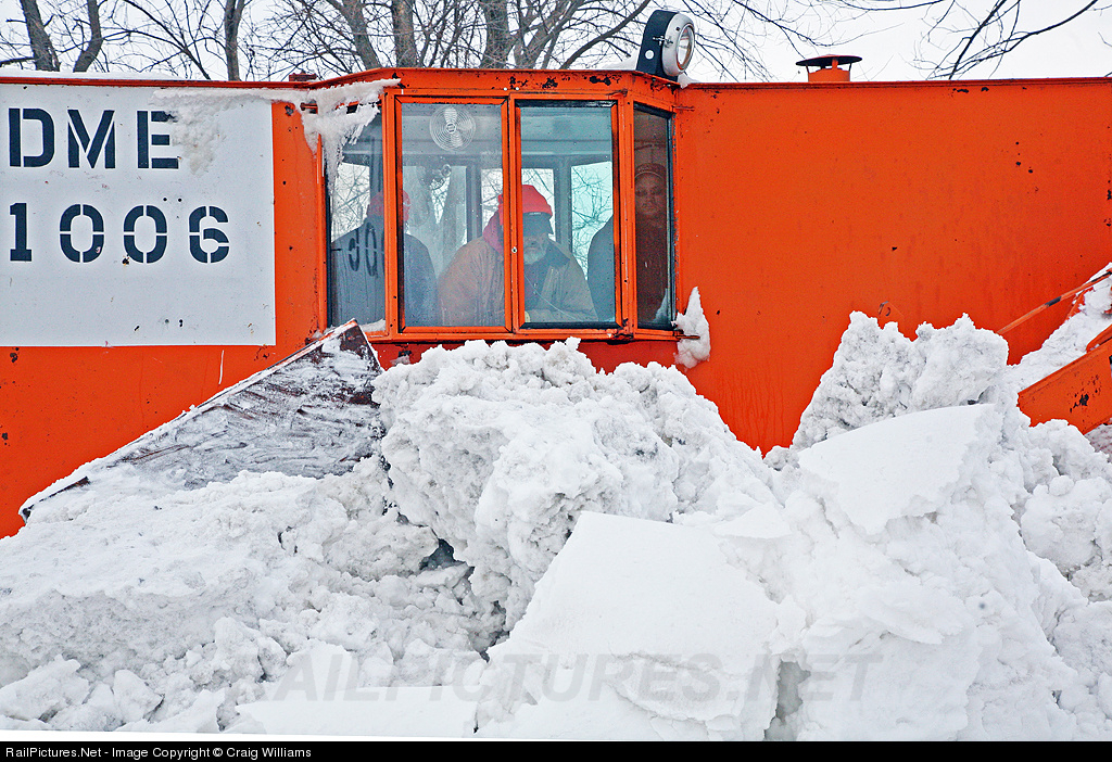 | The same 2 guys run the plows jobs around the Mason City area each winter. Takes some talent and nerves to put up with all the headaches that go with working with this 1955 equipment. Here the operators keep a close eye out on the wings of the ditcher near MP 4. The conductor relays to the engineer want those guys want as they move along at walking speed. |