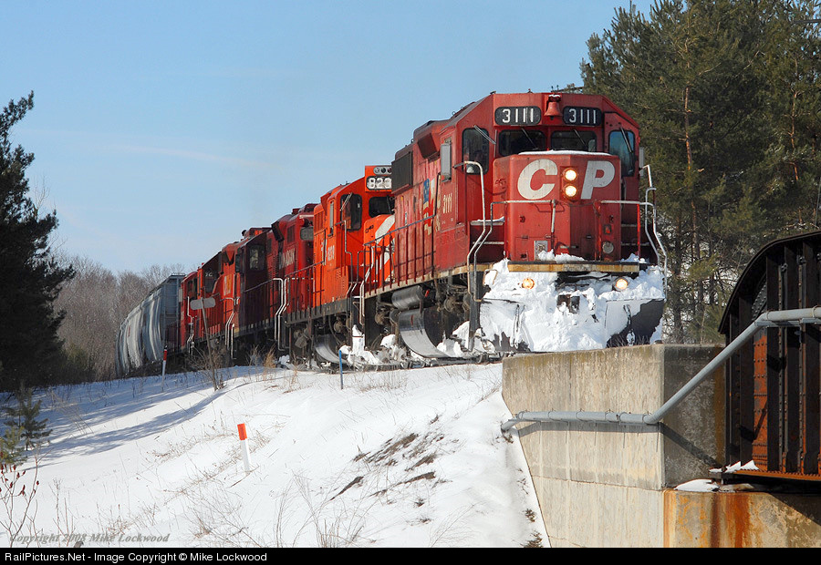 Making it's way east, KLR train T08 is about to cross the bridge over Simcoe Street at Raglan, Ontario. Small drifts and snowbanks at grade crossings have left their mark on the power, consisting of CP 3111, 8239, 8200, 3114, and SLH 8245, but it's nothing the five units can't handle. 1047hrs.