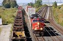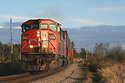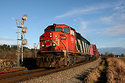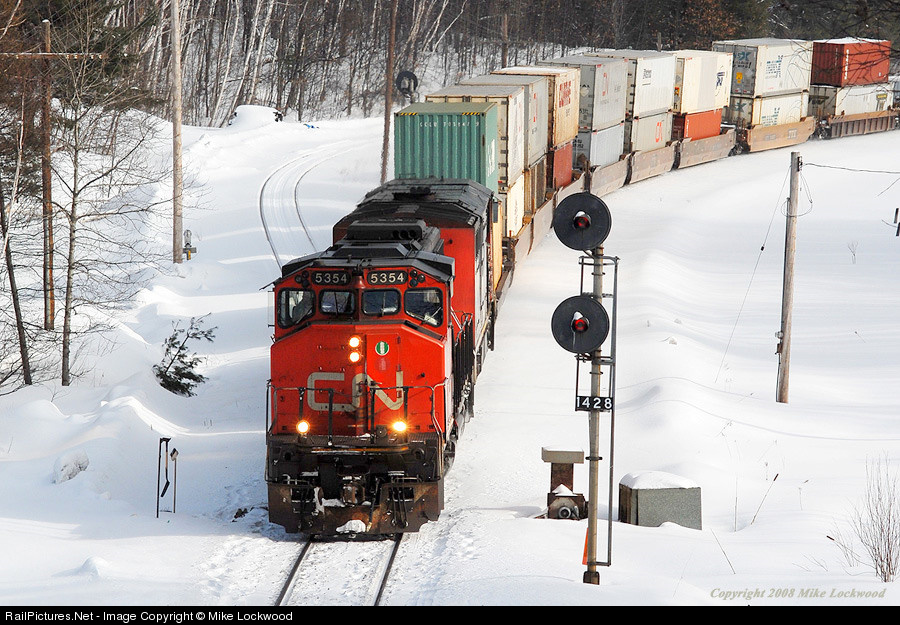 With snow up to the railheads, CN 5354 and 2414 slow 105's train to change crews at Falding, Ontario. After waiting almost and hour for the crewbus with the outbound crew, 105 will be underway again, crossing over to CP's Parry Sound Sub as part of the directional running agreement between CN and CP. 1022hrs.