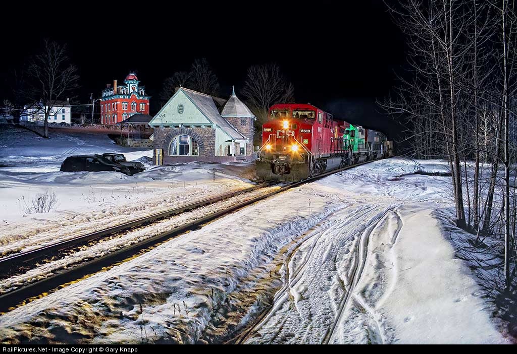 CP 252 passing a timeless scene in Port Henry, white building dates from 1889, ornate Victorian styled ex-LC&M G.O.B. from 1875, both overlooking the station built 1888. What a contrast the diesels provide, coming out of the darkness! Think of the locomotives and trains that have appeared here over the ensuing years.......