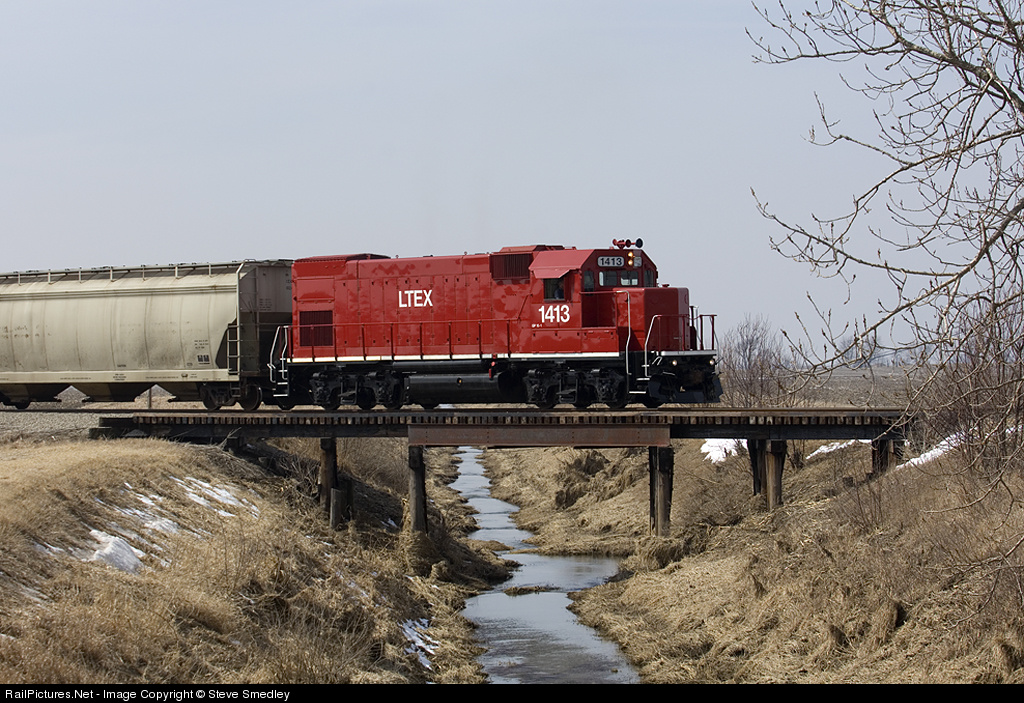 | Seen from the Ward Bridge, the Bloomer Line leased GP15-1 is on its first test run. When the 18 car train gets to Cropsey, crews will combine the 1413 and the Bloomer 7561 with the other loads and head North to Risk.