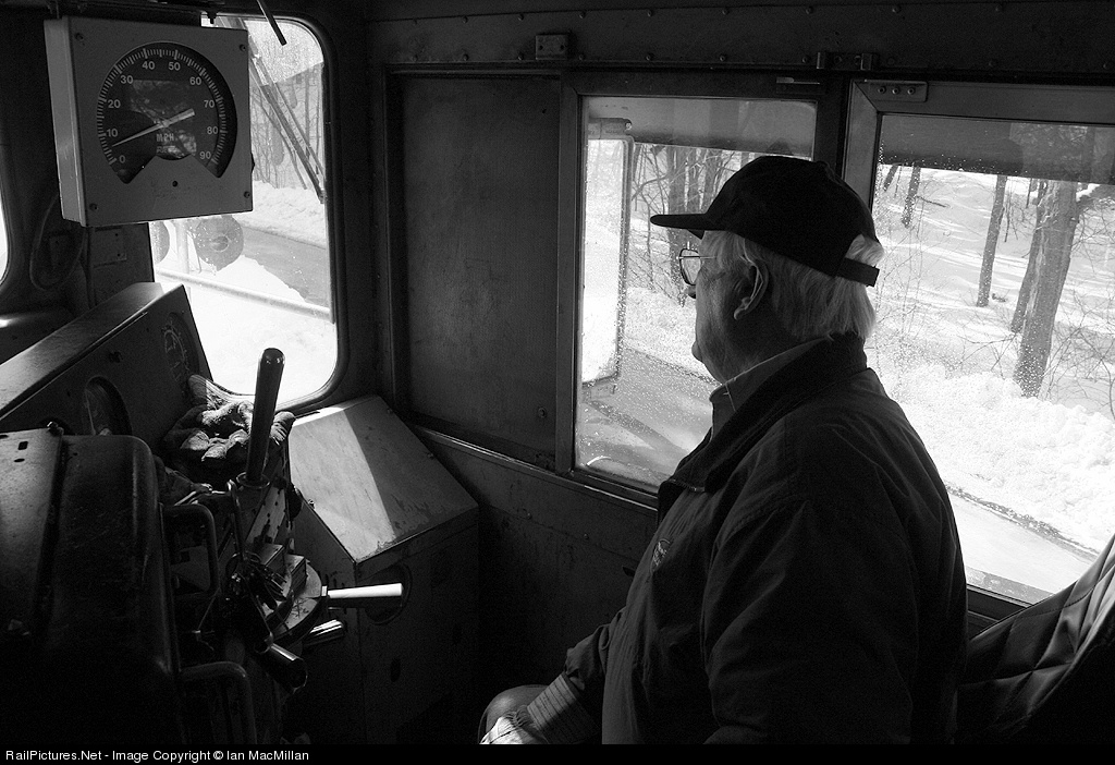 | New England Southern engineer and owner, Peter Dearness, pilots our train through a foot a freshly fallen snow on the PAR New Hampshire Mainline as we head south to Manchester to interchange with Pan Am Railways. |
