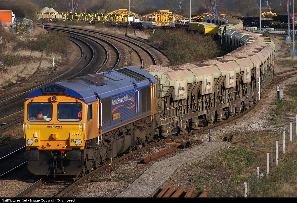 66720'Metronet Pathfinder' shunts Wellingborough with the LaFarge self-discharge train.This is the first load of aggregates for Wellingborough Yd's virtual quarry.