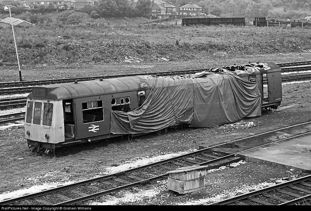 An old shot from 1977. A burnt out hulk of a Class 108 DMU is stored off its bogies at Newton Heath. It wasn't long before it was cut up.