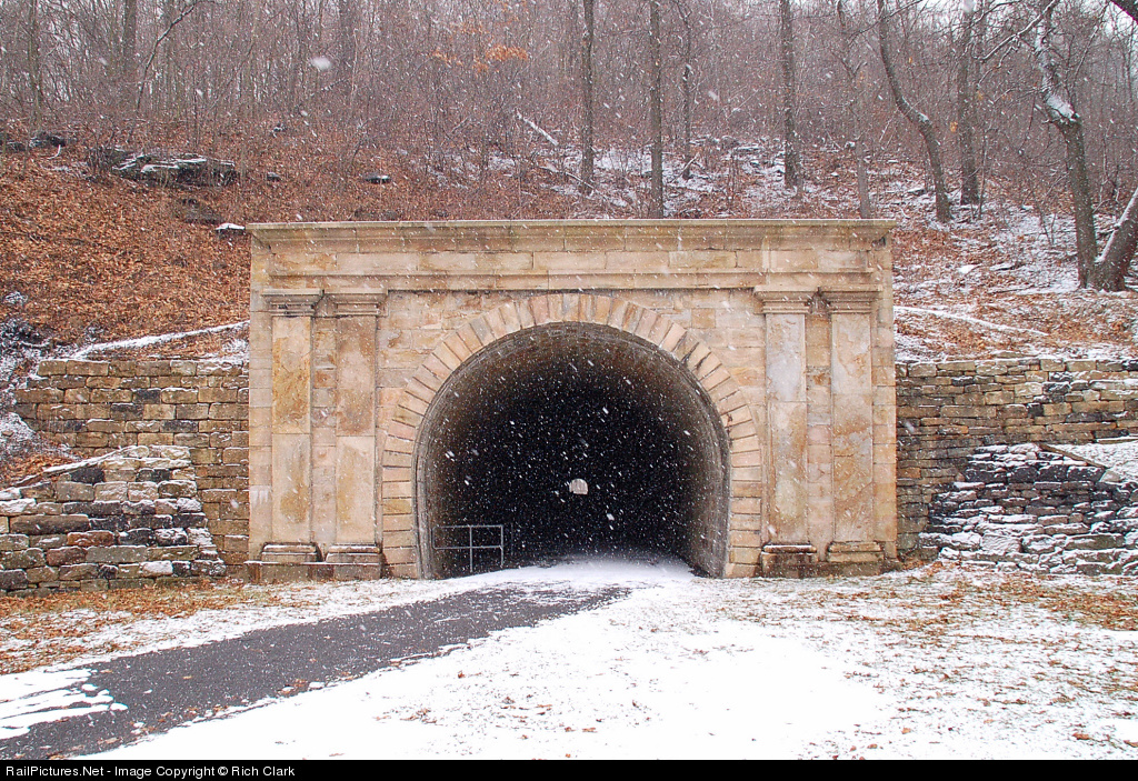 The Staple Bend Tunnel was the first RR tunnel built in the United States, started on April 12,1831 and finished in 1834. It served the Allegheny Portage RR, a combination of an incline system and typical RR that shortened travel time from Philadelphia to Pittsburgh from 3 weeks to 4 days. The tunnel is 900' long mostly of natural rock and a architectural work of art having 150' of blocks at each end. The West portal shown here with the original Roman Revival facade and sprinkle in a little Allegheny Mtn snow that followed me the whole time!