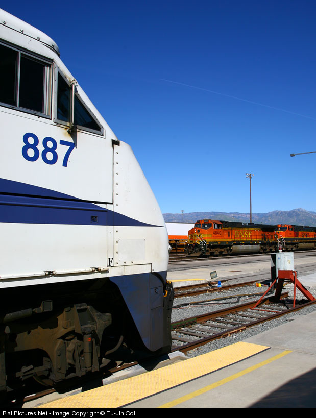 A Metrolink rests quietly on this beautiful Sunday afternoon as BNSF 4840 rolls slowly to a stop. After the K SBDSBD1 09 cleared the area, BNSF 4840 would continue west.