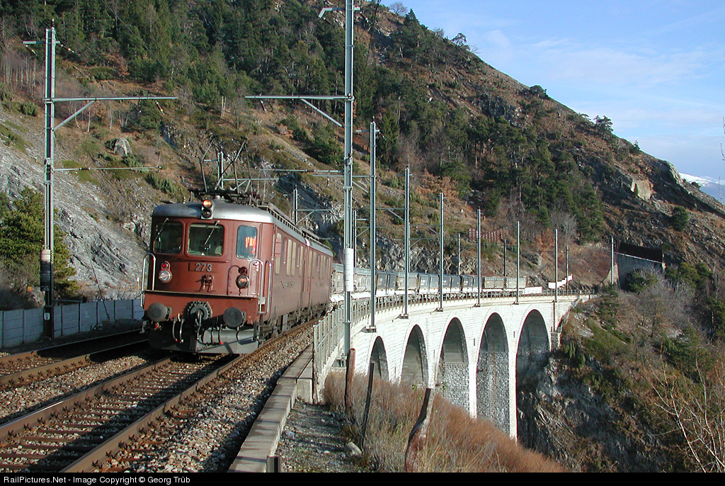 When they were built from 1959 to 1966, the 5 electric locomotives Ae 8/8 of the BLS belonged to the most powerful of the world, with 8800 HP. Today all are withdrawn from service but one is still in operational condition. The train is seen on the 50 m high Luogelkinn viaduct near Hohtenn on the southern ascent to the Lötschberg tunnel.