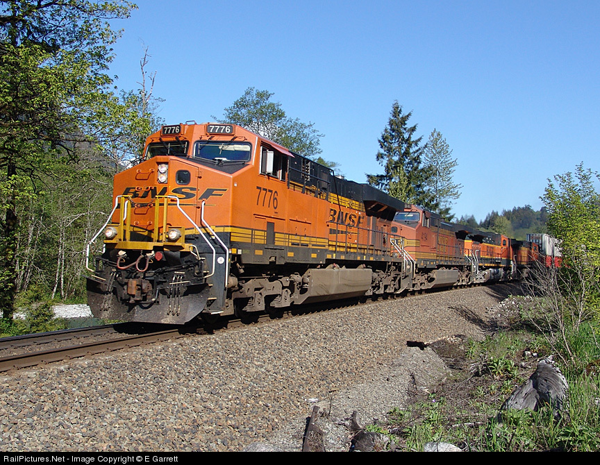 Sprinting up the west slope of Stevens Pass, 7776 cants into a curve beside the Skykomish river. In the days of electrification, steam power would switch out at Skykomish a few miles ahead, but with diesels that is no longer necessary ... or possible now.