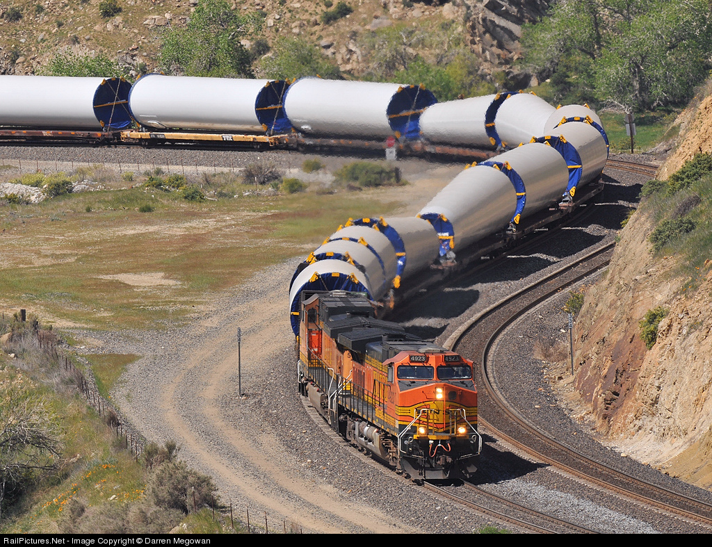 BNSF 4923 leads its train loaded with wind generator assemblies up the Caliente Creek canyon with two C44-9Ws on the head end and two DPU on the rear.