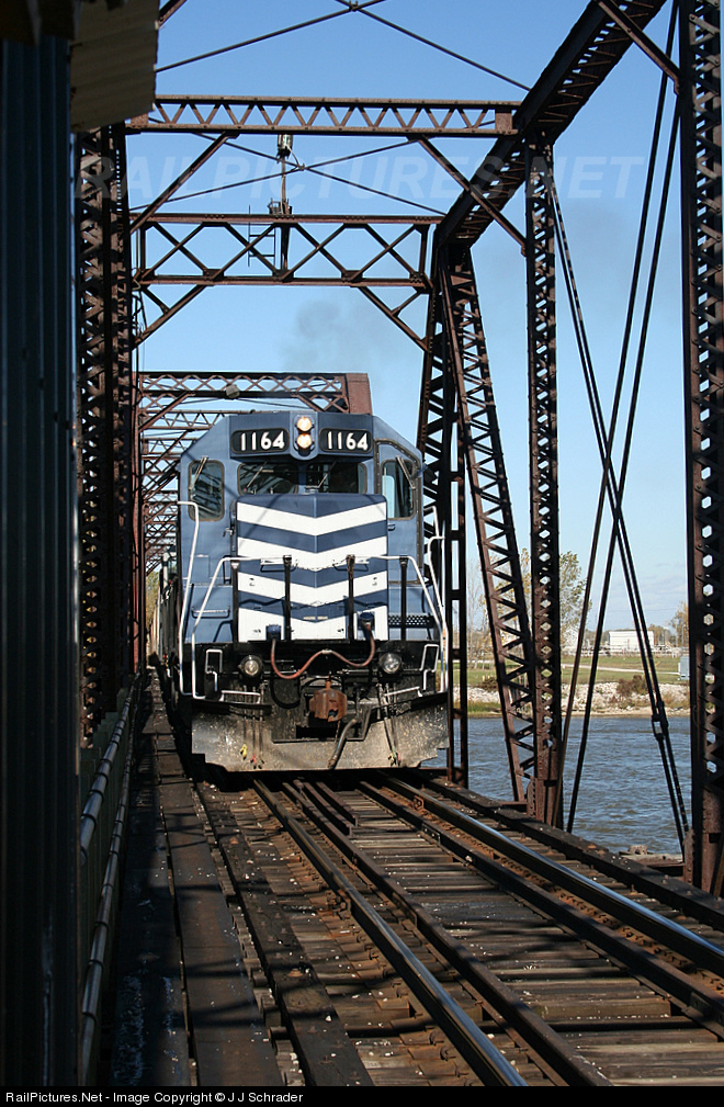 | Saginaw Bay Southern Railway train Z126 pulles across the Saginaw River bridge after picking up a unit train of rock from parent railroad, Lake State Railway. The trains ultimate destination is Flint, MI. |