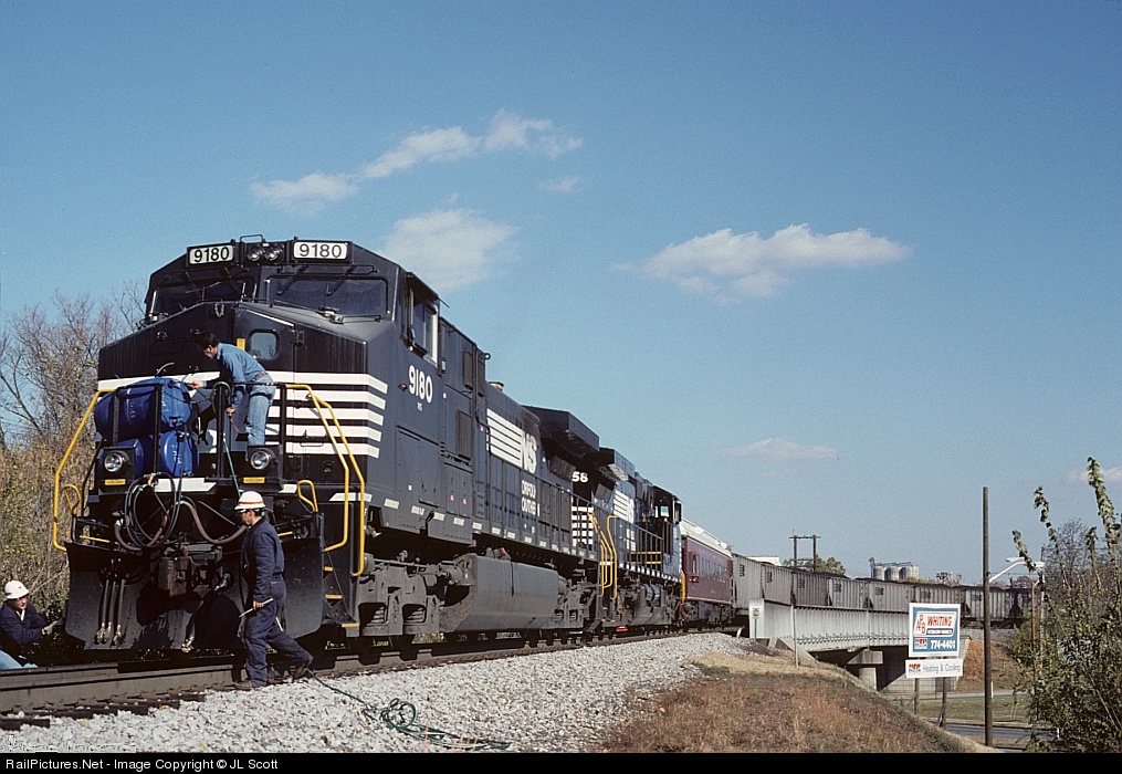 NS did testing on C40-9Ws in addition to Conrail SD70Ms and SD80MACs in November 1998 (note research car NS 32 behind the locomotives). The train has stopped near the bottom of Starkey Hill and the water barrells are being filled with a garden hose prior to a "wet rail test" on the grade. The water was provided by a local business on Franklin Road the train has stopped behind. When I shot this picture I still found Dash-9s new and exciting...