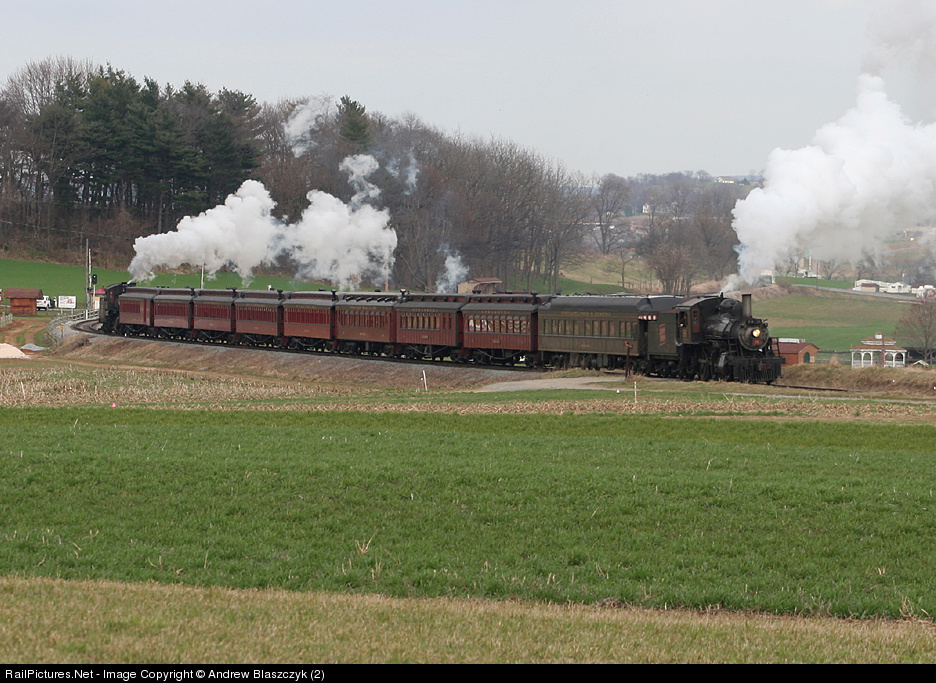 | With the two 'big' engines in the shops, Strasburg was forced to use a helper on their 9-car Easter Bunny Trains. Here both engines work hard up the 1% grade between Cherry Hill and Esbenshade, where the helper would be cut off. With N&W 475 due out in early summer and GW 90 to follow soon after, it may be a while before we see non-charter helper service again. |