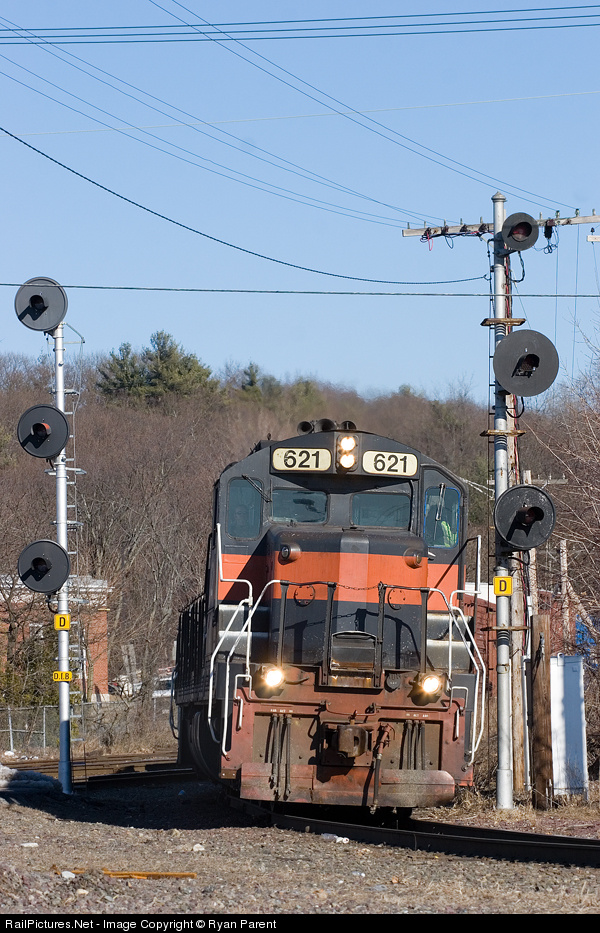 | ST 621 rolls onto the east leg of the wye at Ayer pulling WASE (Waterville, ME - Selkirk, NY ) into the hill yard to drop the train for CSX. ST 621 is one of two SD26's still in operation on Guilford. |