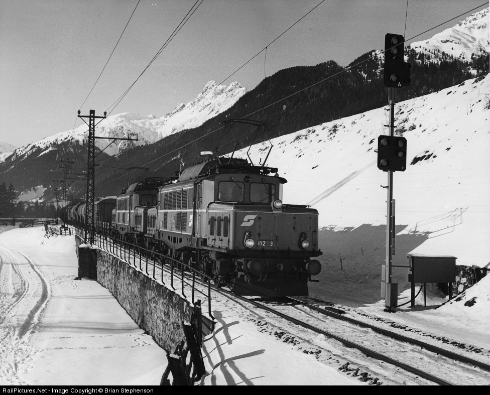 | A pair of former Deutsche Reichsbahn E94 Co-Co electrics pass Pettneu in the Austrian Tirol with an eastbound freight on the Arlberg line. No 1020.17 is the second loco. |