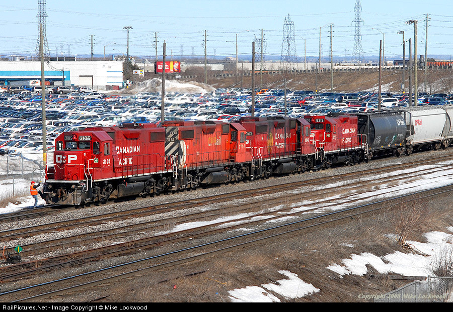 Arriving at Toronto Yard in Scarborough, Ontario, KLR train T07's conductor gets back on board after lining the switch to exit the Havelock Sub and enter the yard. Not seen is CP 1684, a rebuilt former TH&B GP7, waiting for T07 to enter the yard so she may continue her work. The old girl was a little shy and hid under the Finch Avenue East bridge, and allowing only a partial shot. CP 3105, 3114, 3043 and 8215 power T07, and looks like 3043 is throwing oil out the stack. 1158hrs.