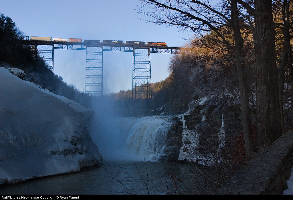 At sunrise BNSF 1070 leads train 12T west over the trestle spanning the Genesee River and the high falls in Letchworth State Park.