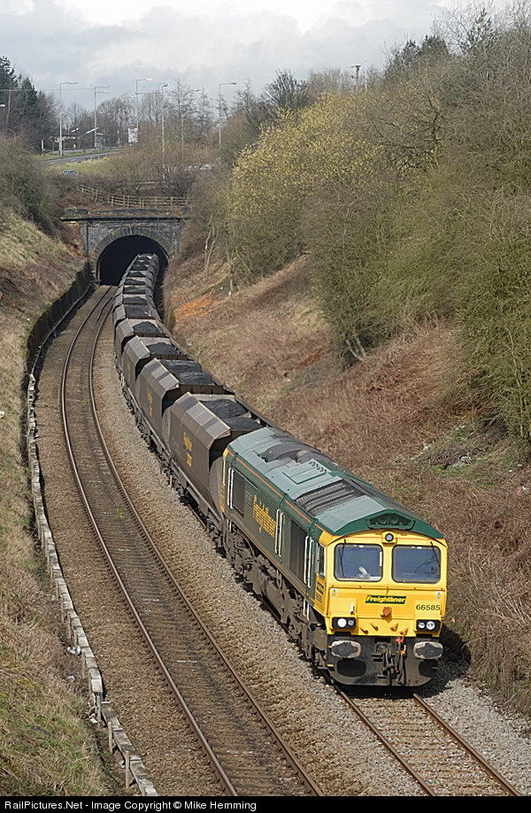 | Freight Liner class 66 585 has just past through Oakengates Tunnel and about to pass under Hollinwood over bridge with loaded coal hoopers 6Z82 the 07-00hrs Portbury (Bristol) to Rugeley Power Station |