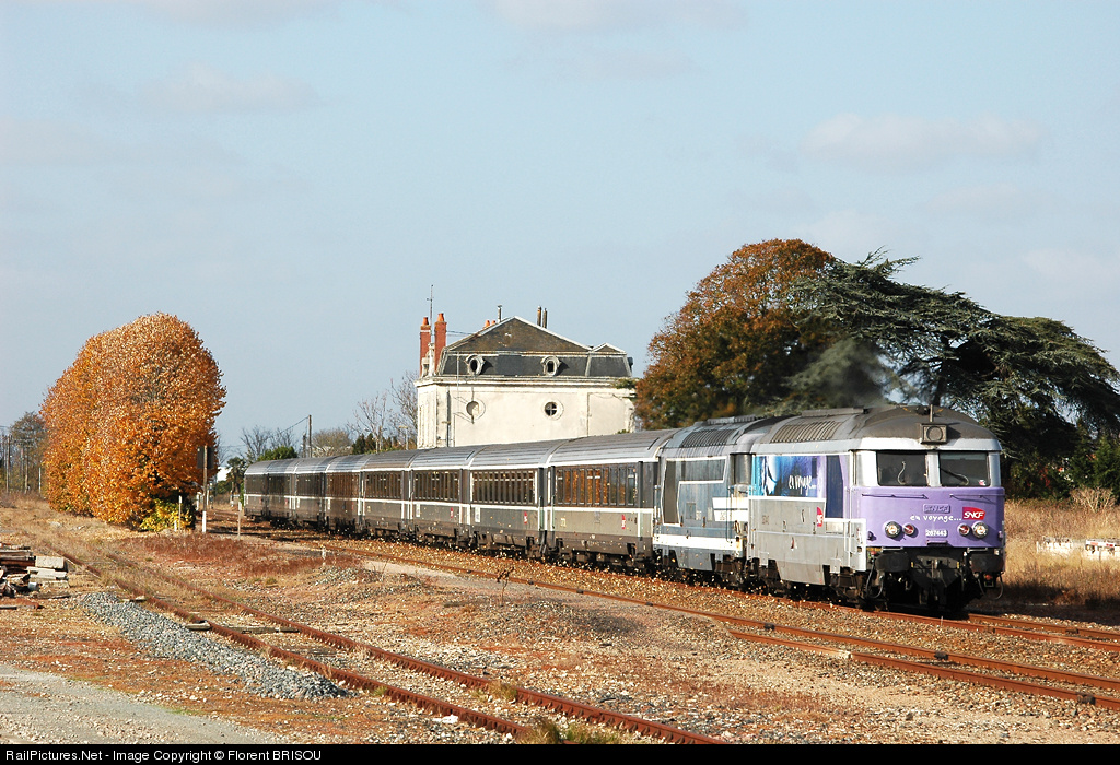 | A very nice station building (no more in use), built in the 19th century by the Compagnie des Charentes, is facing a rank of nice automn couloured trees as this Toulouse to Nantes passenger train is passing at 110 kph, making leaves flying all around. |