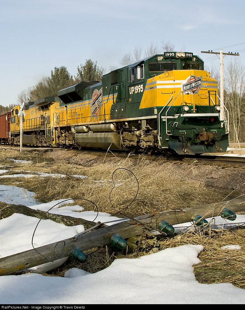 UP 1995 and CNW 8701 pass a long time fallen phone pole.