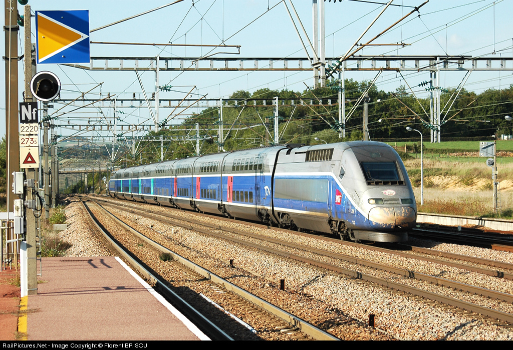 | Racing at 300 km/h down to south of France for this TGV Duplex in single unit linking Paris to Marseille, passing on middle tracks (reserved for non stopping trains) of Le Creusot TGV station. |