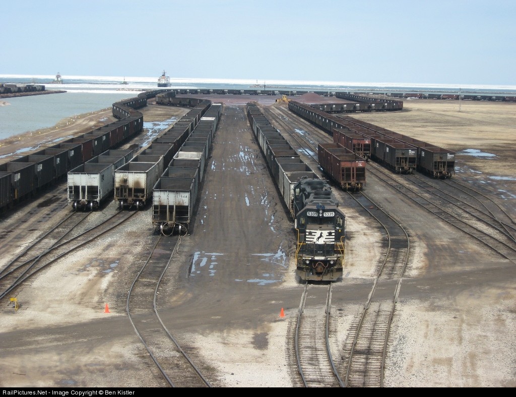 Behind unit 5335 is NS 5232. Off in the distance is Lake Erie, where you can see a ship and lots of ice.