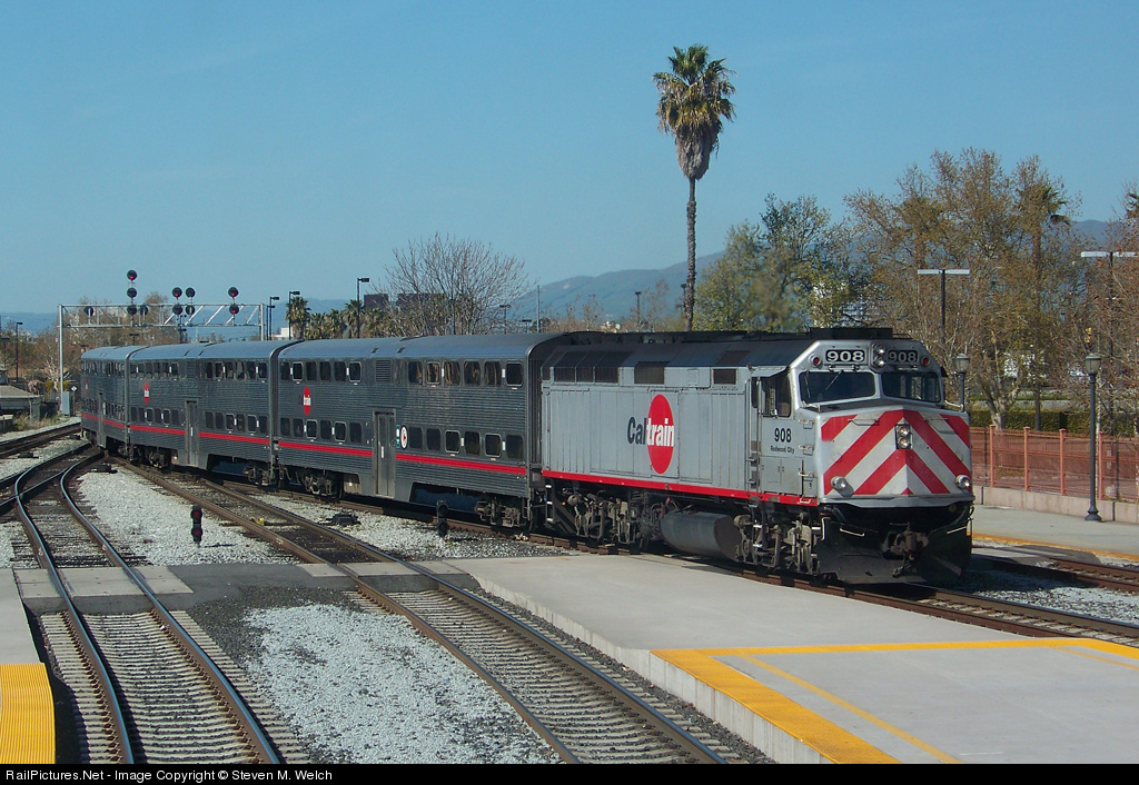 | A Gilroy-bound Caltrain arrives in the depot, with CalTrain F40PH 908 leading. |