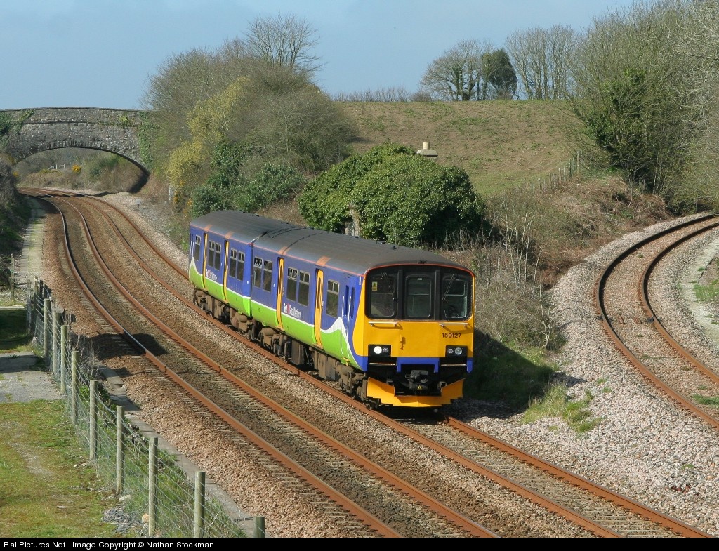 | Showing off its bright Silverlink livery and looking somewhat out of place in Cornwall, 150127 nears St.Austell with the 10:36 from Penzance. The unit has recently been transferred to FGW to help with their rolling stock shortages. |
