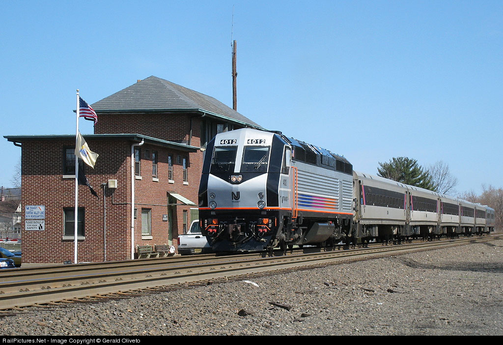 | PL42AC 4012 leads a westbound train past the former Jersey Central Railroad's Boyd Tower in Raritan. The PL42s are being eased into service on NJ Transit's Raritan Valley Line, formerly the Jersey Central Railroad's mainline linking the ports of New York with the mountains of Pennsylvania. |