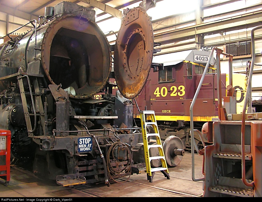 Ohio Central 4023 shares the shop with Nickel Plate Berk 763 in the begaining stages of restoration. Ahead of her B36-7 3613 is also in the shop. In front of 763 is GP38 2175 in the prosses of being rebuilt into a GP38-3