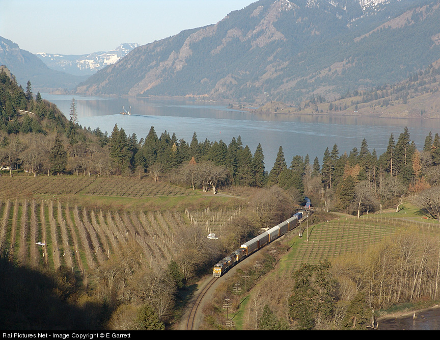 | I'm always impressed by the broad scenic photos submitted by our European friends, but have realized that there are some similar views to be had in North America as well. A UP stacker (with some autoracks at the head end) picks its way eastward through orchards and vineyards deep in the Columbia Gorge of Oregon. |