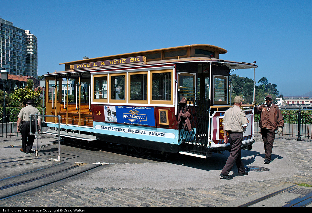 | San Francisco Municipal Railway cable car 14 takes a spin on the "arm-strong" turntable at the north end of the Railway's Powell/Hyde Line. This line, and Powell/Mason Line, operate single-end cars requiring turntables at each end of the lines. |