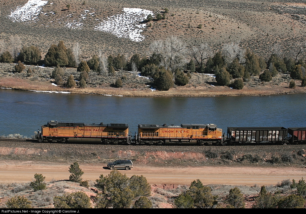 | UP 5755 heads east along the Colorado River. And the very dusty Chevy Suburban parked alongside the tracks, has seen its fair share of dirt roads. |