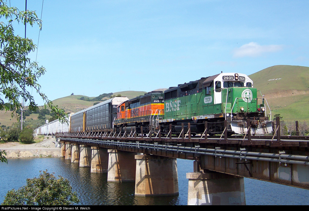 | BNSF 2931 is back on the Warm Springs, paired up with BNSF 6929, as it crosses the Alameda Creek on a clear Spring afternoon. |