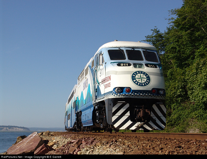 Sound Transit locomotives face south, so for those who catch the afternoon commute from Seattle to Everett, we find the power in push mode, as is 911, the "Mariners" unit.