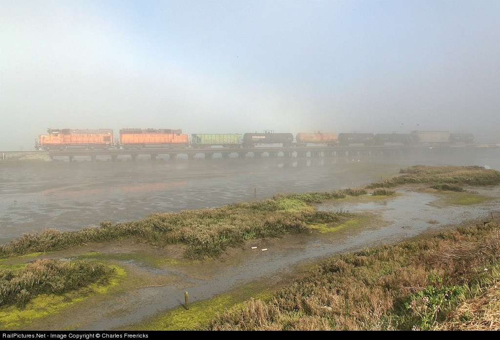 The 'Garita's in the Slough! The Santa Margarita Turn crosses over the Elkhorn Slough in a blanket of fog. Amazingly, it was sunny and clear less than a mile from here, but as I drove into the Slough area, we were socked in with pea soup. Didn't slow the train down though, which had already hit track speed. This bridge's official name is the "Elkhorn Slough Railroad Bridge," of course. The GP15-1 comes from Missouri Pacific and was delivered to the MP in August of 1981.