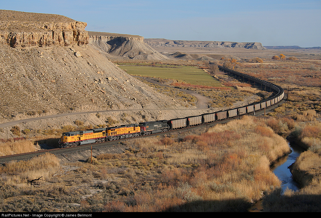 A long haul coal train (West Elk, Colorado to Moapa, Nevada) charges west through the Green River Desert on a spectacular late fall afternoon in 2007. This trackage was once part of the D&RGW system, Subdivision #5.