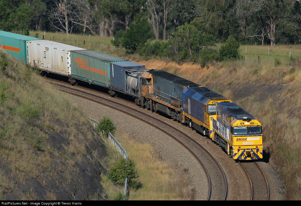 | Freshly repainted engine of NR121 in the new scheme leads a South bound Intermodal into township of Picton,the new scheme features the southern cross on the side on the engine. |