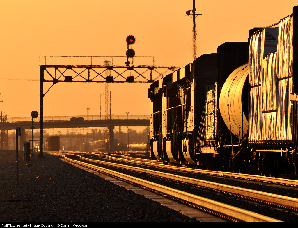 | The day is almost over for this BNSF crew as the sun sets over Bakersfield, while a UP manifest gets underway in the distance, after a crew change. |