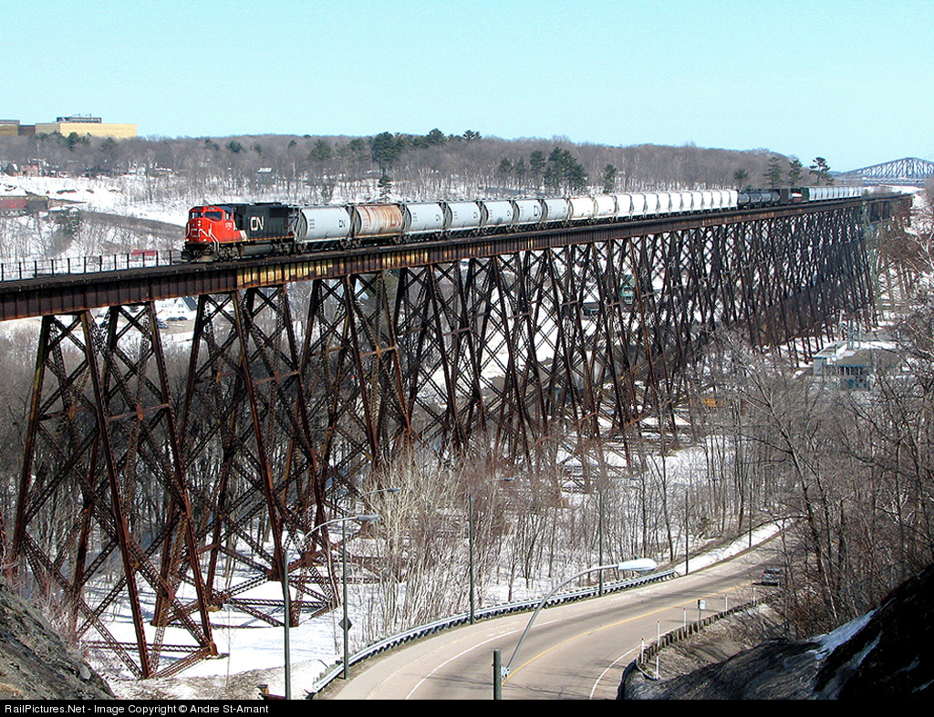 CN 427 has just left Joffre yard (south shore of Quebec City), and is crossing the trestle in Cap Rouge, on the LaTuque sub, on its way to Garneau. This bridge, built in 1908, spans 3,335 feet at an average of 172 feet above the ground.