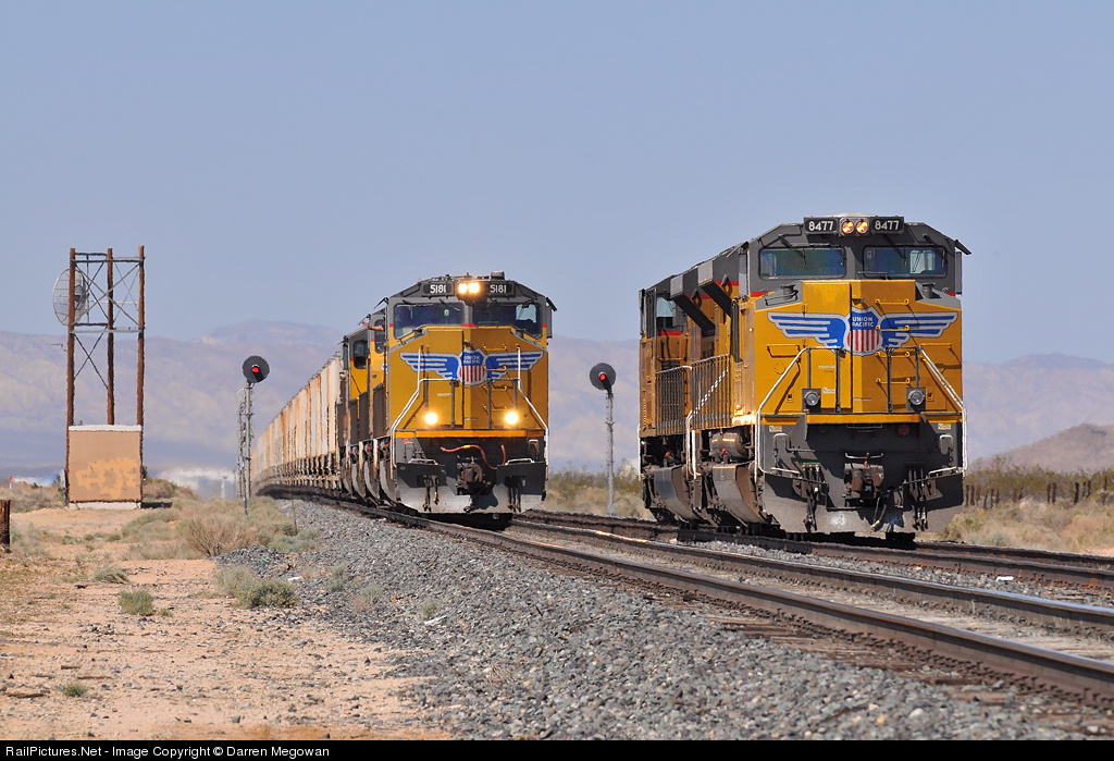 LOP82 power sits in the hole as UP 5181 South, a unit train that originated on the Trona Railway, rolls by.