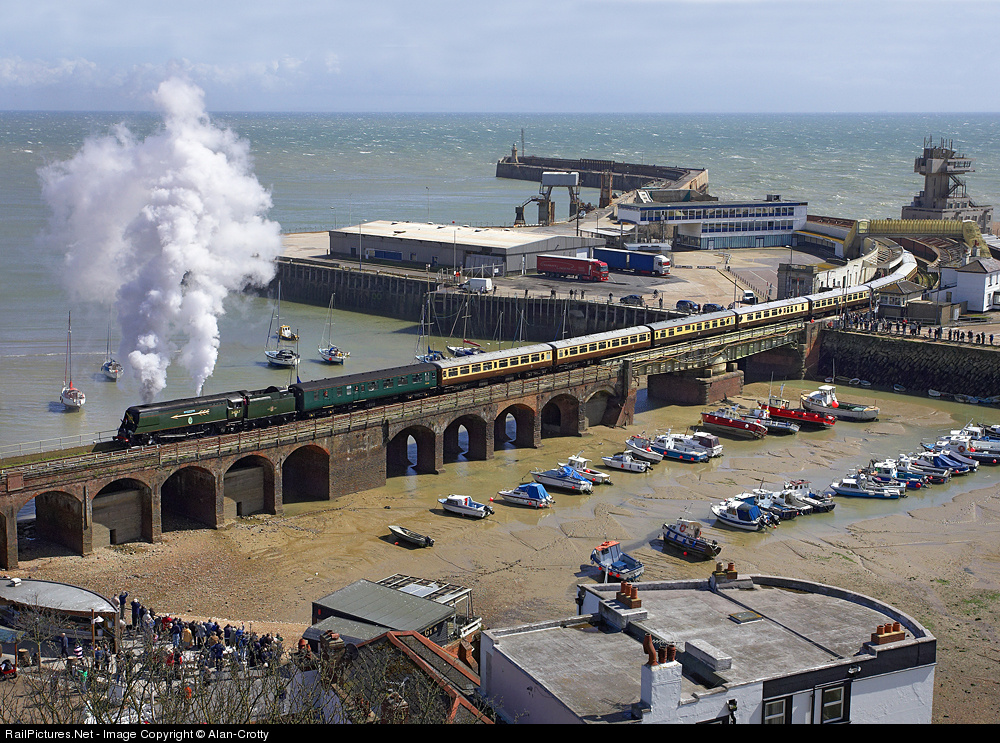 | On a fine spring day Battle of Britain 'Air Smoothed' pacific 'Tangmere' starts the last steam hauled passenger train up the 1:30 gradient from Folkestone Harbour to the mainline junction. The locomotive is carrying the full 'Golden Arrow regalia as used in the 1950s.